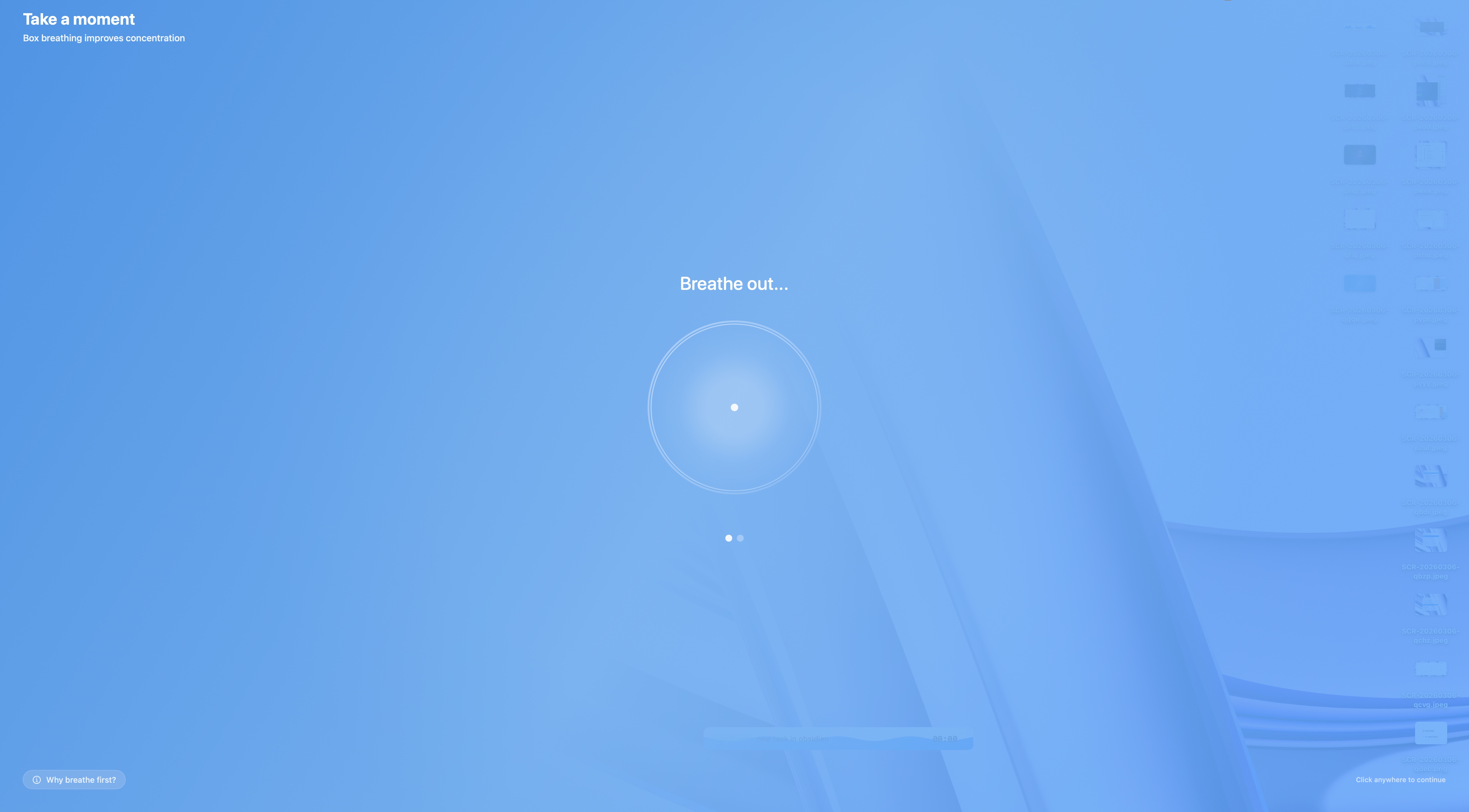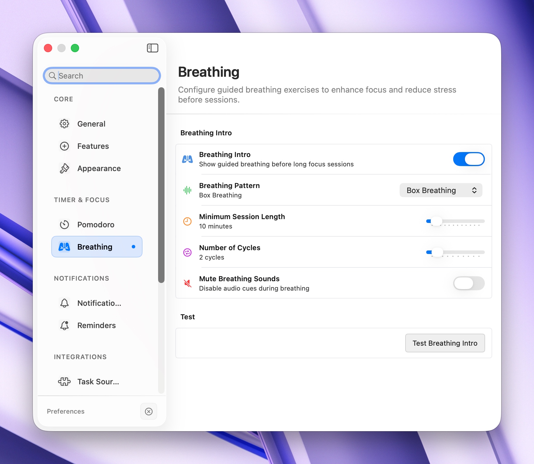 Breathing preparation works beautifully with Focus's other features. Start with a breathing exercise, then dive into a Pomodoro session with website blocking. Your calm state stays protected by workspace management that eliminates distractions automatically.Every feature is designed to work together — creating a complete system for ADHD-friendly focus.